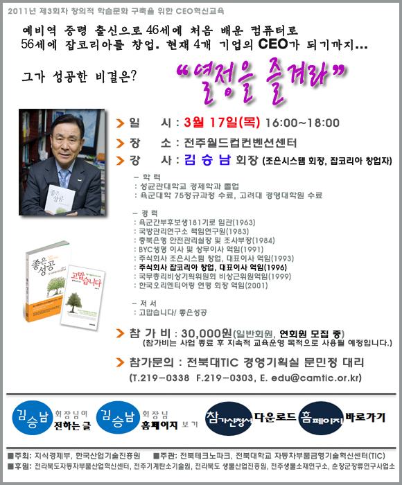 3월 CEO혁신교육 안내!! - 김승남 회장(조은시스템 회장, 잡코리아 창업자)