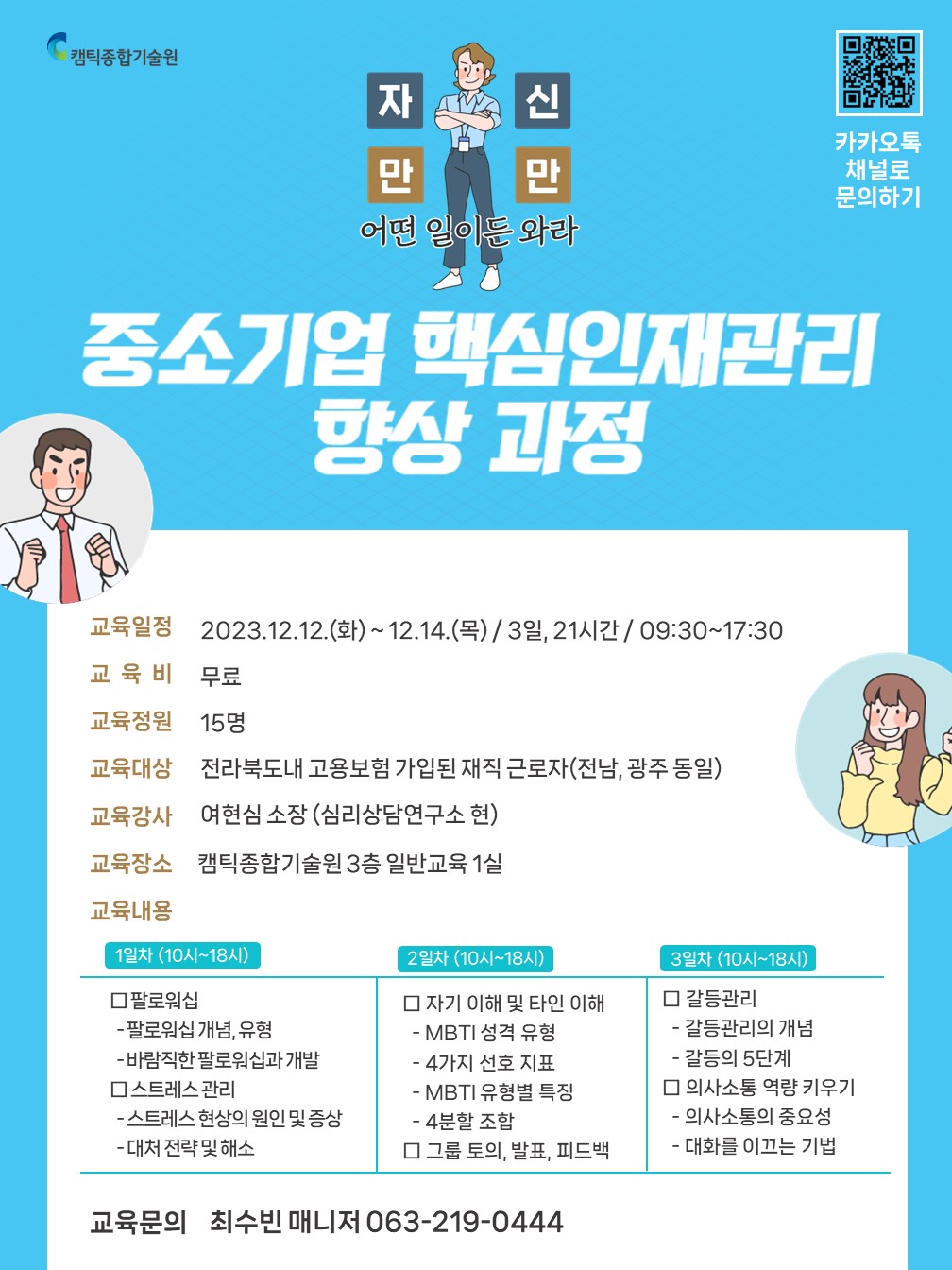 카카오톡에 “캠틱인재개발센터”를 검색하시면 실시간으로 문의가 가능합니다.
